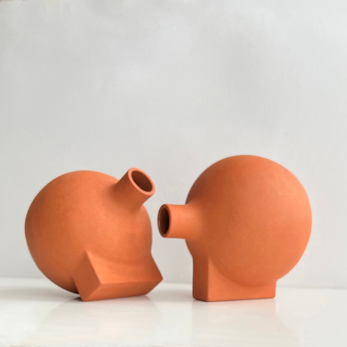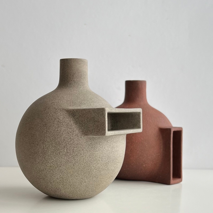 I use geometrical forms as a starting point to explore form, while thematically responding to what is happening in the world around me. One form follows the next. I build by hand and leave the surface bare, often incorporating local sand to mediate surface tone and a connection to place. Into clay I bring a background as an art director, a Master of Design, a diploma of ceramic art and a curious mind. Originally from Trondheim, I’m based in Oslo after a two decade interlude in New Zealand.
