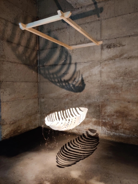 Hvitglasert steingods, 3D-modellert og 3D-printet PLA og rundstokk i furu. 150x150x150 cm. Verket berører en rekke sentrale begrep som utfordrer en opplevelse av framskritt. Framskrittet er personlig…