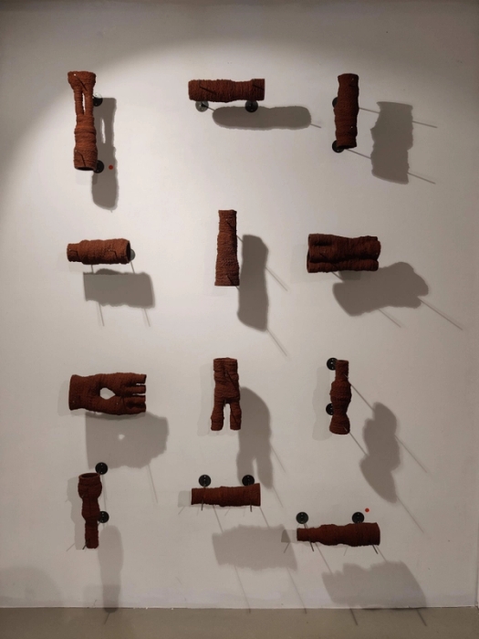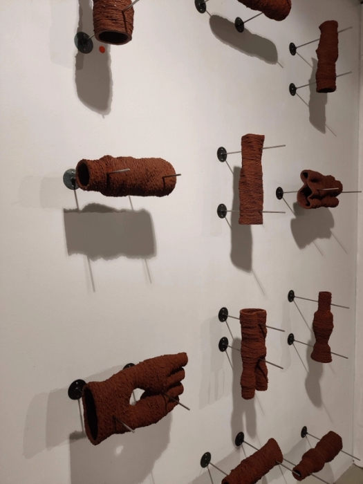 Dreid og råbrent steingods, delt med vinkelsliper. Montert med kobbertråd i treramme. Verket berører tema makulering, oppløsing og destruksjon. Krigen i Ukraina ligger som et bakteppe. På grunn av i…