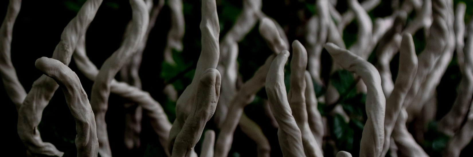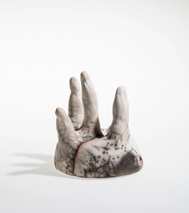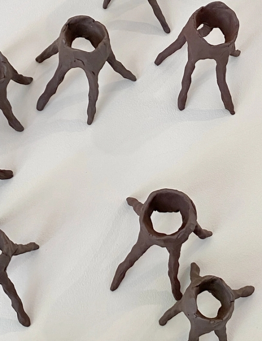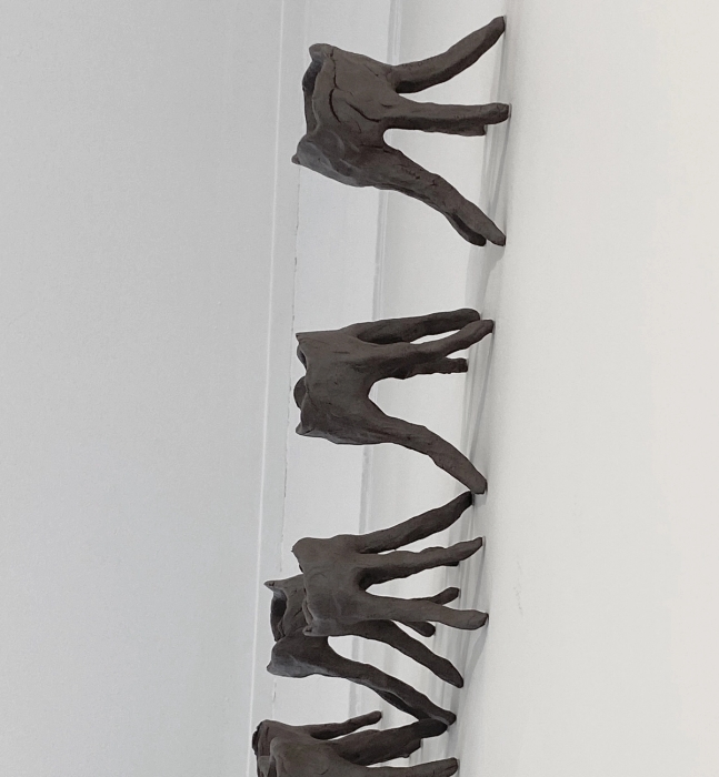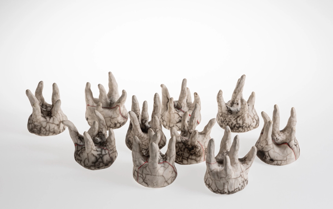 Norske Kunsthåndverkes Årsutstilling i 2018. Frozen movements. Modellert terracottaleire malt lagvis med flytende porselen, brent 3-5 ganger. Variable mål. Her har jeg brukt varmluftpistol under model…