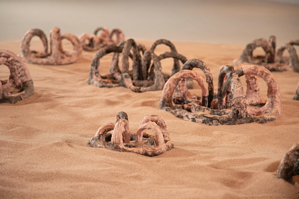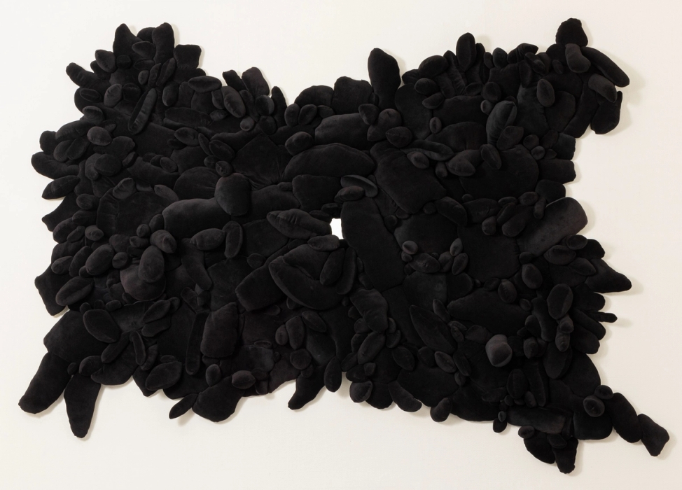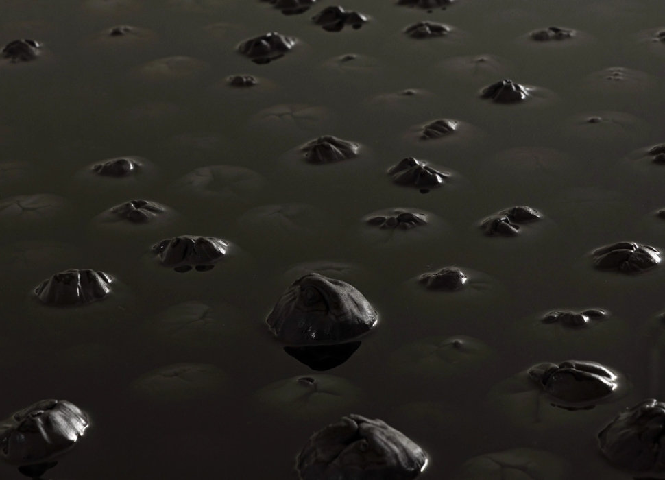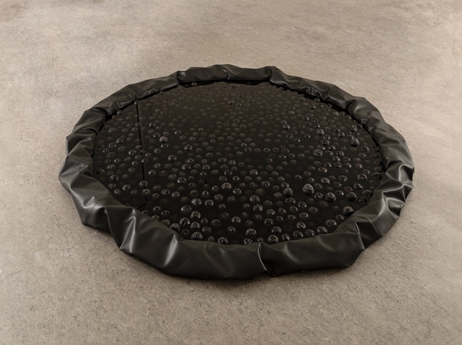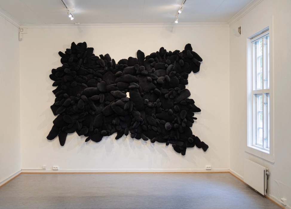 2021-2023. Drøyt 700 objekter i modellert svart porselen, vann, blekk, gummiduk og sandsekker. Ca. 200 cm i diameter.