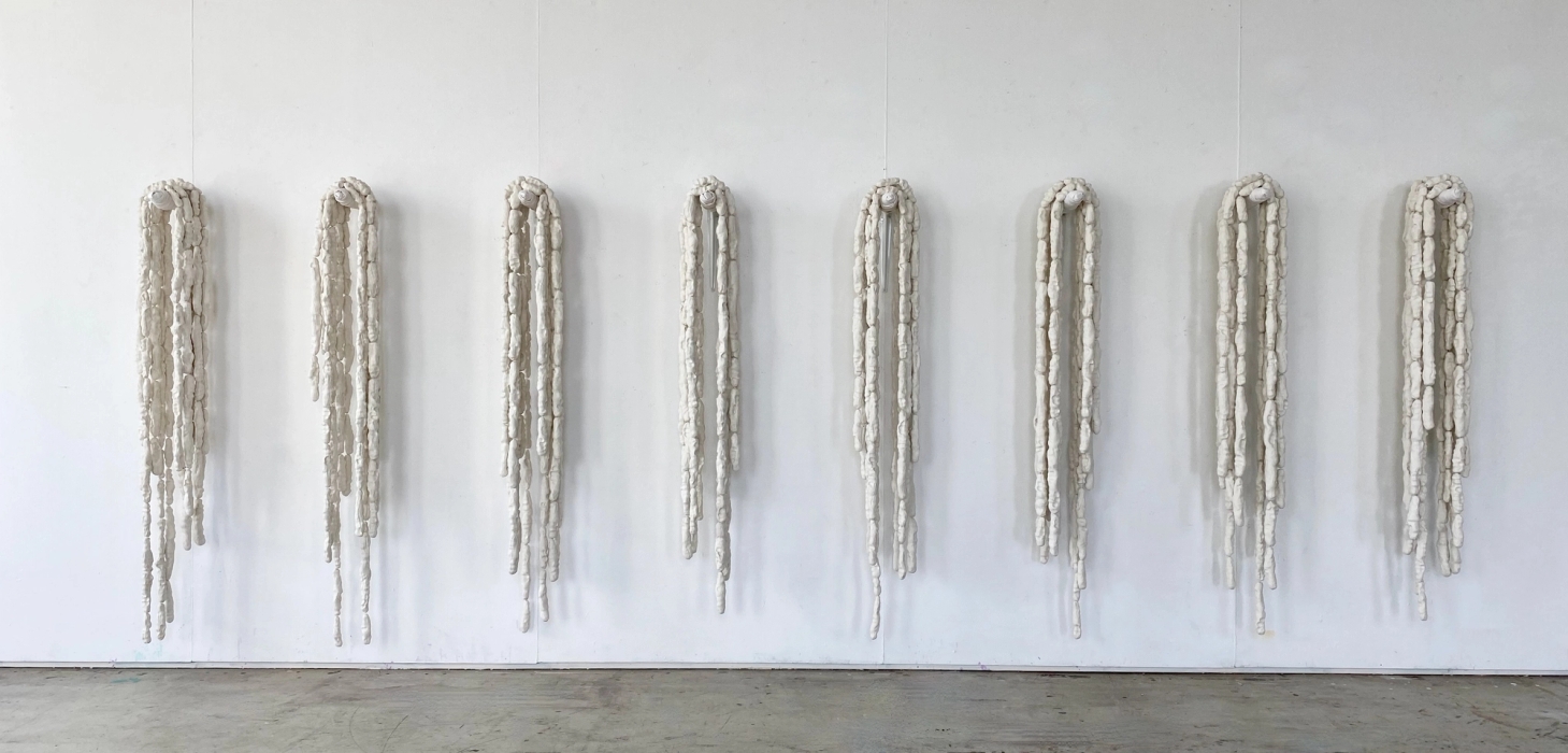 2021-2023. Modellert porselen, hylleknekter, bomullslerret og nylonsnor.