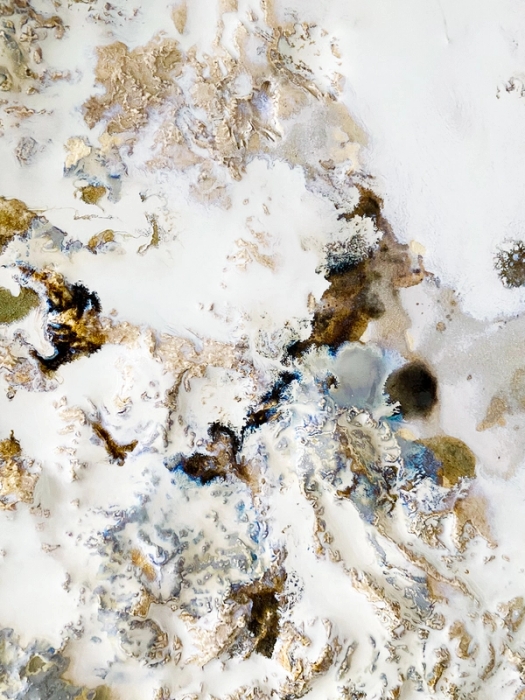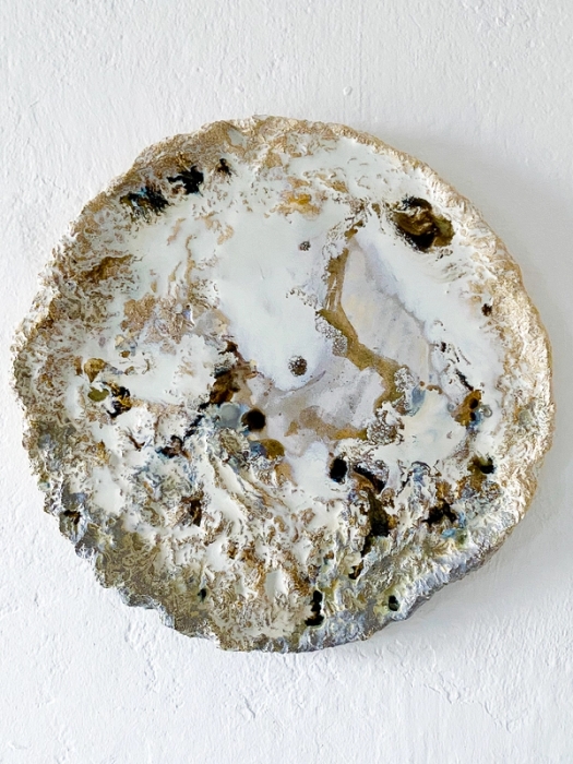Relieff i steingods forma med vrakstein fra gruvedrift, glasert med gruveavfall og titandioksid. ø52 x 7 cm. 2024. Visast i Norske Kunsthåndverkeres Årsutstilling 2025 på Lillehammer Kunstmuseum.