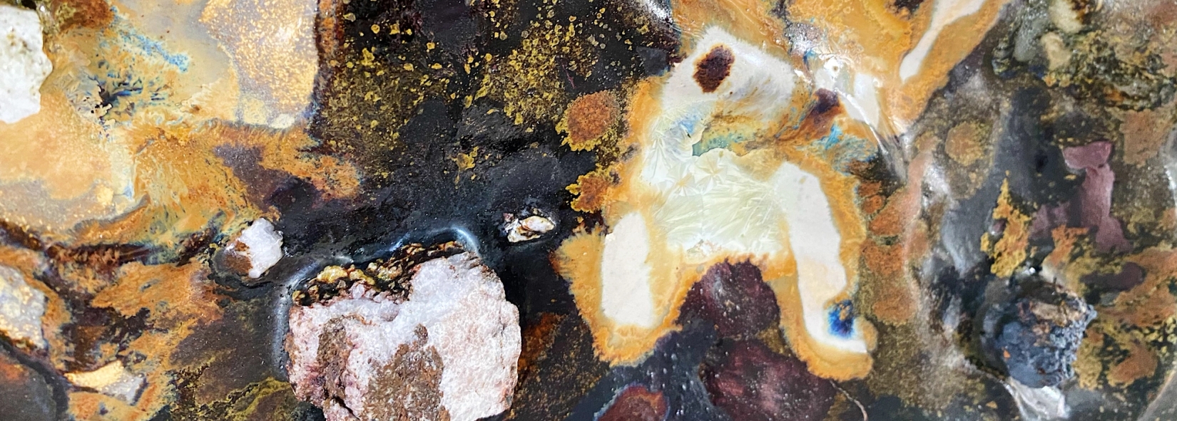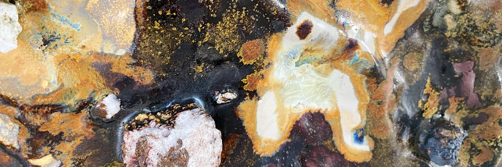Glasert steingods. Forma med avfallsstein frå gruvedrift og glasert bl.a. med krystallglasurar. Vist i gruppeutstillinga Then Leap på Ram Galleri i Oslo, 2024.