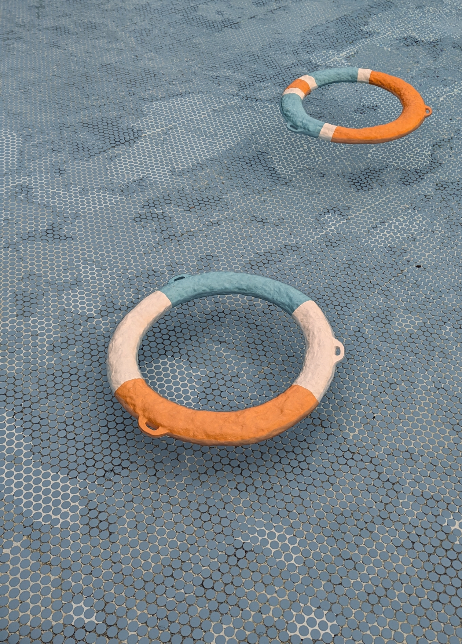 The atmosphere in Piscine Municipale reveals ceramic as the exhibition’s predominant material through a combination of hand-crafted tiles and recycled industrial bricks, whose glazed palette tones exp…