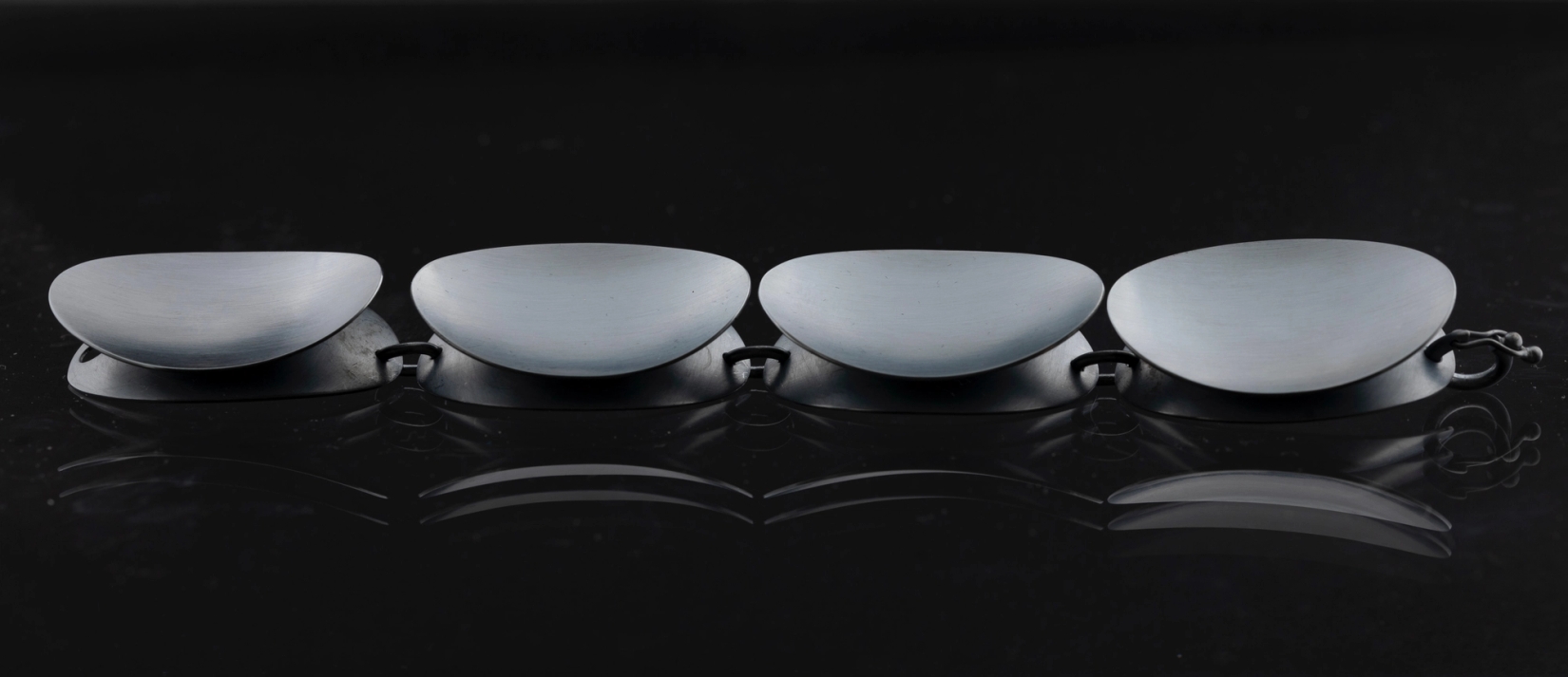 Jeg har over en lengre periode jobbet med sirkelen som utgangspunkt for mine funksjonelle smykkeserier. Sirklene valses til ovaler og slåes opp i konkave og konvekse former. Ovalene settes sammen til enkle, eller til større arbeider i et regelmessig mønster.