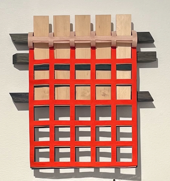 Laserkuttede tekstile grid i bomull og syntetisk materiale, plantefarget silke og plexiglass. Som vist på Trøndelag Senter for Samtidskunst 2023.
