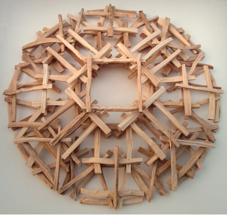 Kløyvde bjørkepinner 120cm x 120cm «Den indre sirkel» består av kløyvde bjørkepinner som er plassert oppå hverandre i et sirlig mønster. Alle pinnene har en form som følger den naturlige veksten, li