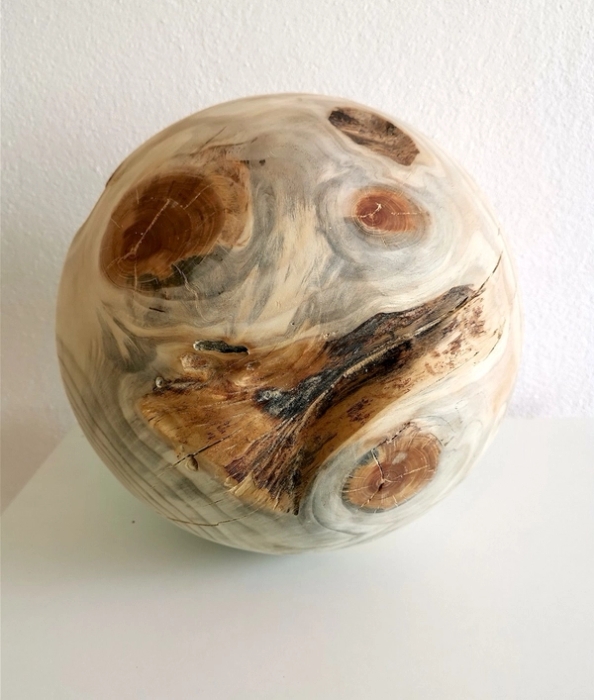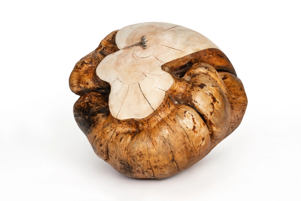 Utskjæringer i funnet stamme av fjellfuru, 45 x 40 x 45cm "Der treet har svart på en forstyrrelse, har livet presset seg sammen lag på lag. Substans springer ut av dette punktet. En form som bærer tr