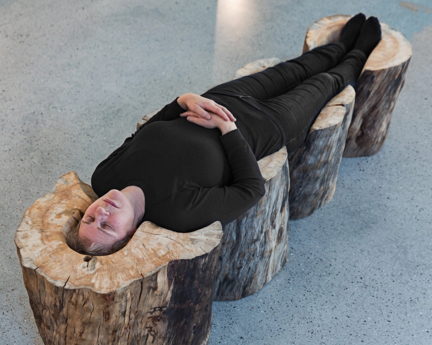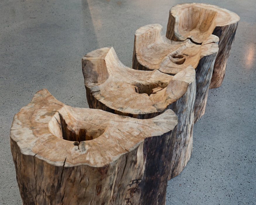 Utskjæringer i fjellfuru. 250 × 55 × 55 cm "Hvile"består av fire stubbeformede deler av stammen fra en flere hundre år gammel fjellfuru. Delene er plassert i rekkefølge, og konturene av en menneske…