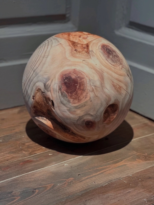 Carved in pine wood. 30cm x 30cm x 30cm 2025 "Sculpture in the Home", 2025. Royal Society of Sculptors. Burgh House, Hampstead, London, United Kingdom. "A