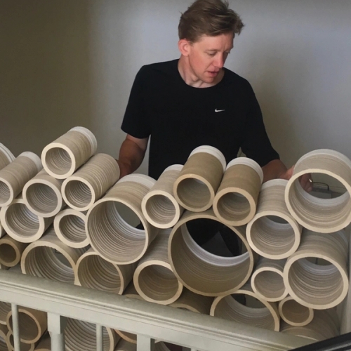 Avgangsarbeidet etter masterstudiet ved kunst-og degsignhøgskolen i Bergen. Ekstruderte og modellerte moduler i steingods