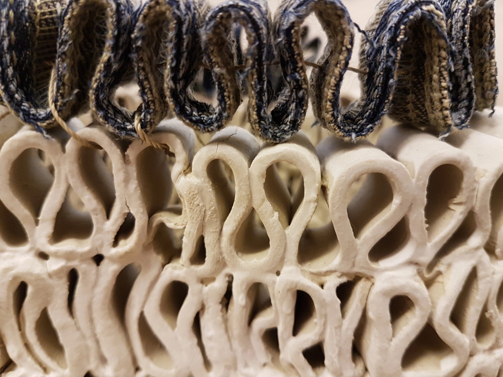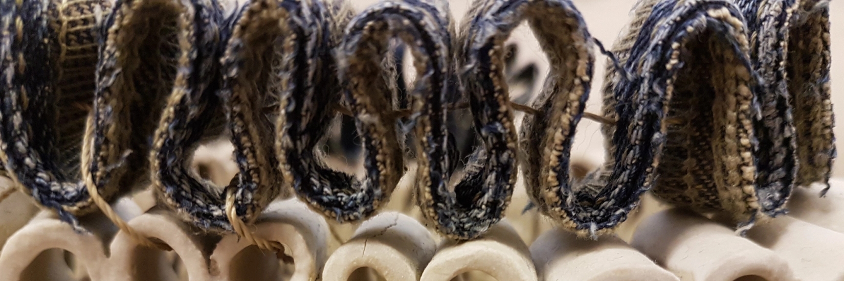 Jeg jobber med form og ornament i lekent samspill, og kombinerer gjerne materialer, leire og tekstil. Jeg ser formene i forhold til hverandre og liker å jobbe i serier.