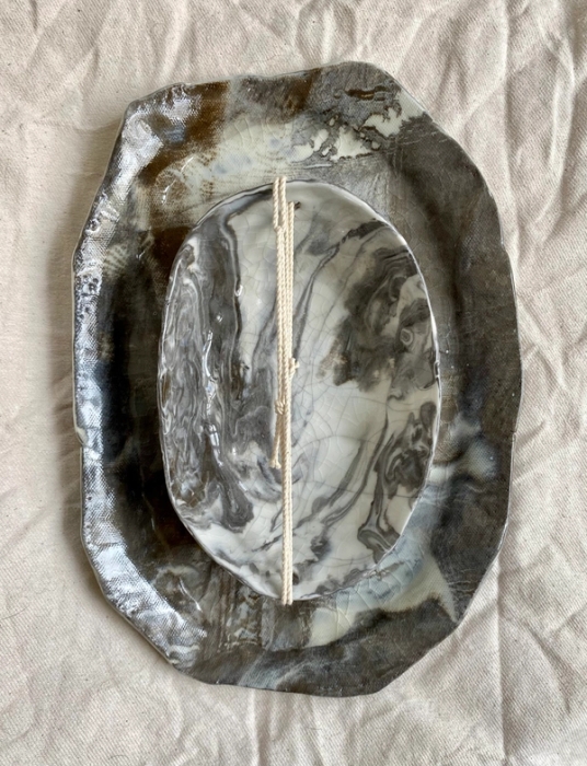 Marmorert svart og hvit porselen. Et fjell og en båt. Etter en båttur hvor jeg så fjellsider med de vakreste svart/hvite mønstre, ble jeg inspirert til å eksperimentere med svart og hvit porselen. Kra…