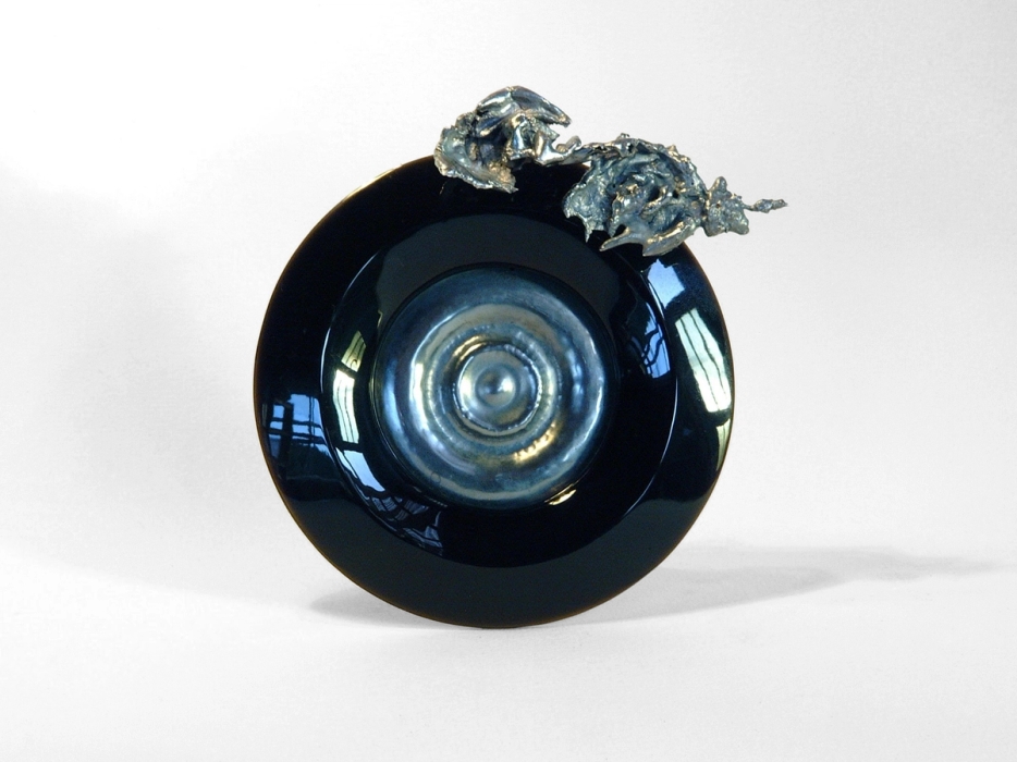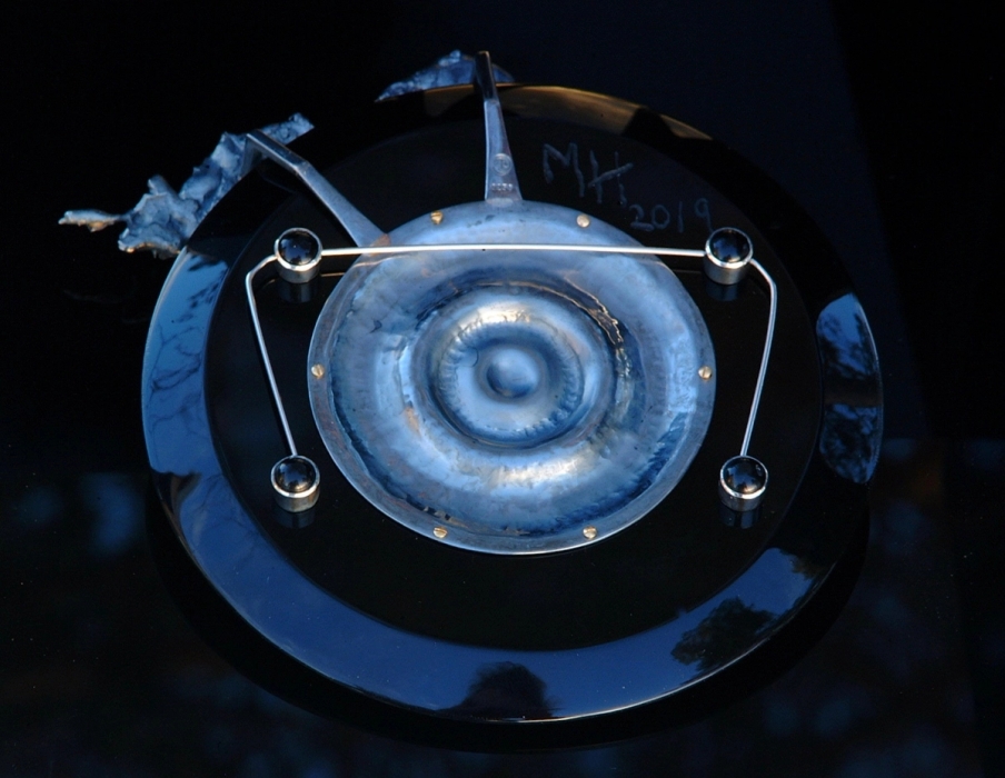 Objekt. Smidd sølv, vannstøpt sølv, carved plast. Bakside: Brosjemekanisme med stål nål og skjulte monteringsskruer i innfattet onyx.
