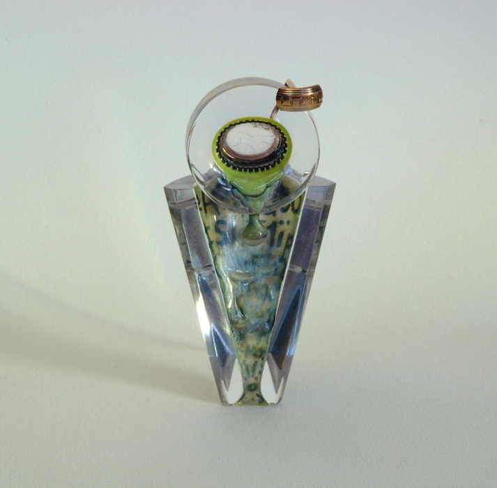 Objekt. Carved polykarbonat med inlay. Brosjemekanisme med stål nål montert i fatningskonstruksjon av 9k gull og oksidert 925 sølv. Innfattet rosenkvarts.