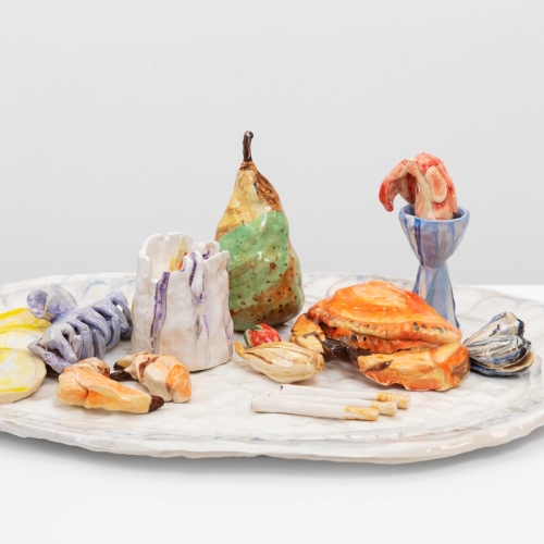 Nellie Jonsson (b. 1992, Umeå, Sweden) is a Swedish emerging artist primarily working with ceramic sculpture and installations. She graduated from the Oslo Academy of the Arts with a BFA (2016-2019) and an MFA (2019-2021) in material-based art with a focus on ceramics. Jonsson's figurative work communicates with an everyday tone, at the same time as unexpected compositions and elements leave a distinctive mark on the playful expression. By immortalizing common objects in clay, Jonsson throws references to consumer culture and everyday life, capturing memories around objects in our lives that we usually don’t reflect on. Her works present a presence – an embracement of difference and personality, as well as an appreciation towards the fact that memories can be created out of the smallest of things. Jonsson is acquired by The National Museum (NO), KODE Museum (NO) and the National Museum of Decorative Arts and Design (NO).