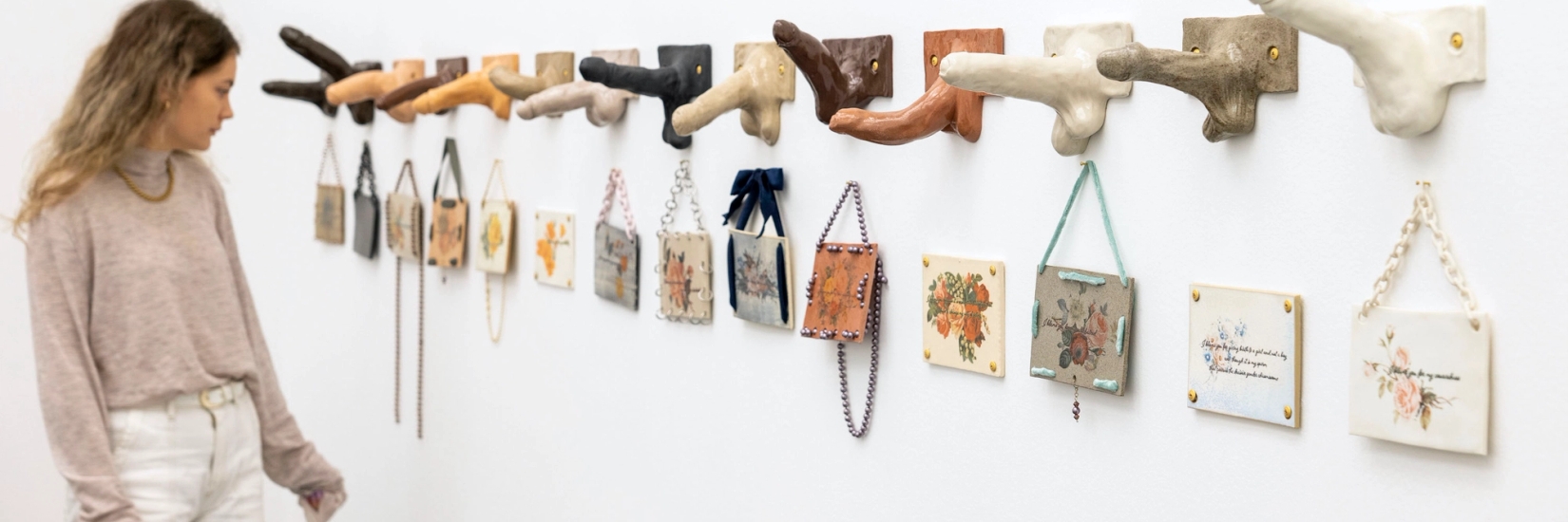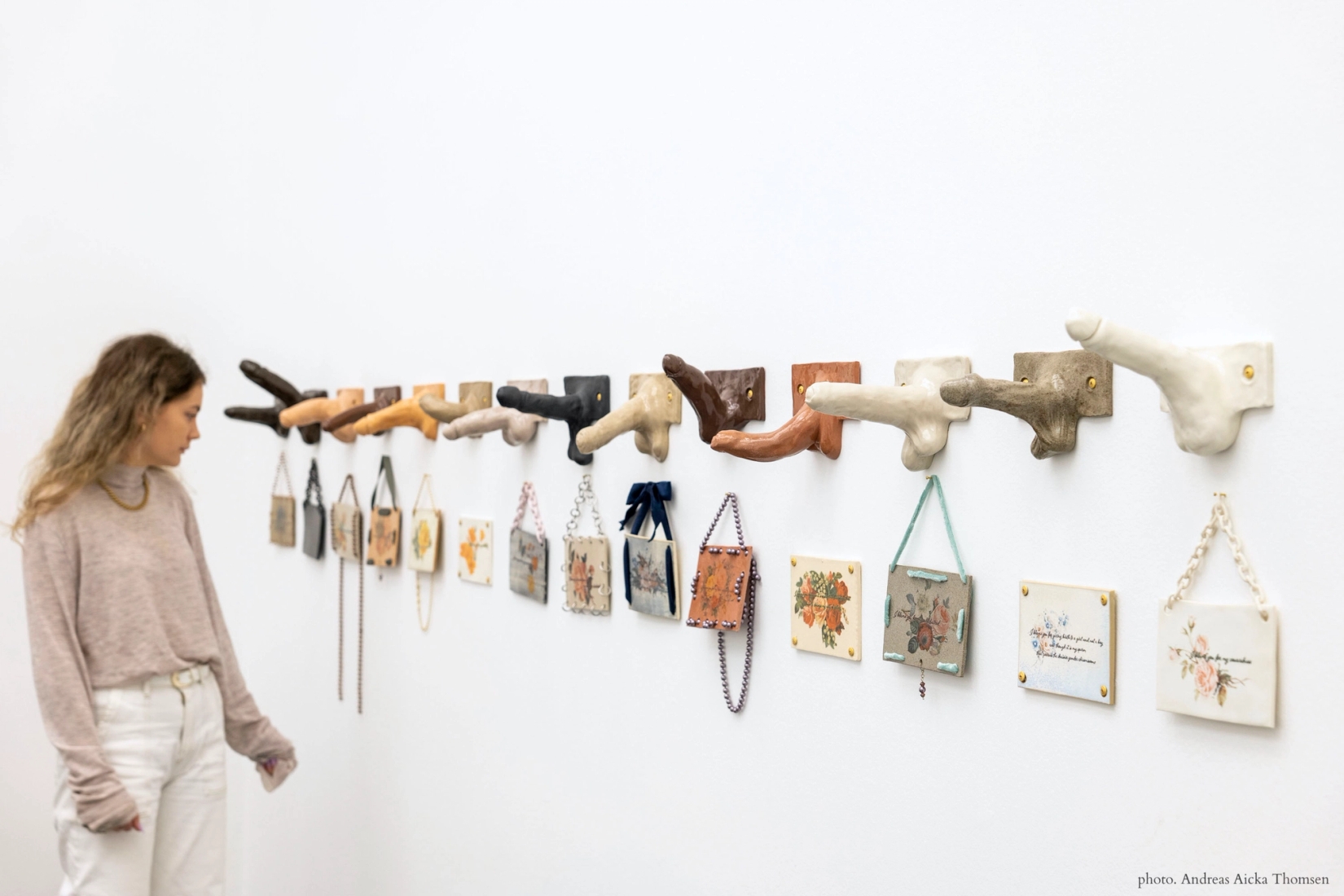 HAND BUILT CERAMICAttached to the wall using golden screws, are a dozen dicks adorn in their natural ceramic “skin tone”. Only glazed with a transparent shine, giving it a wet and in some areas a milk…