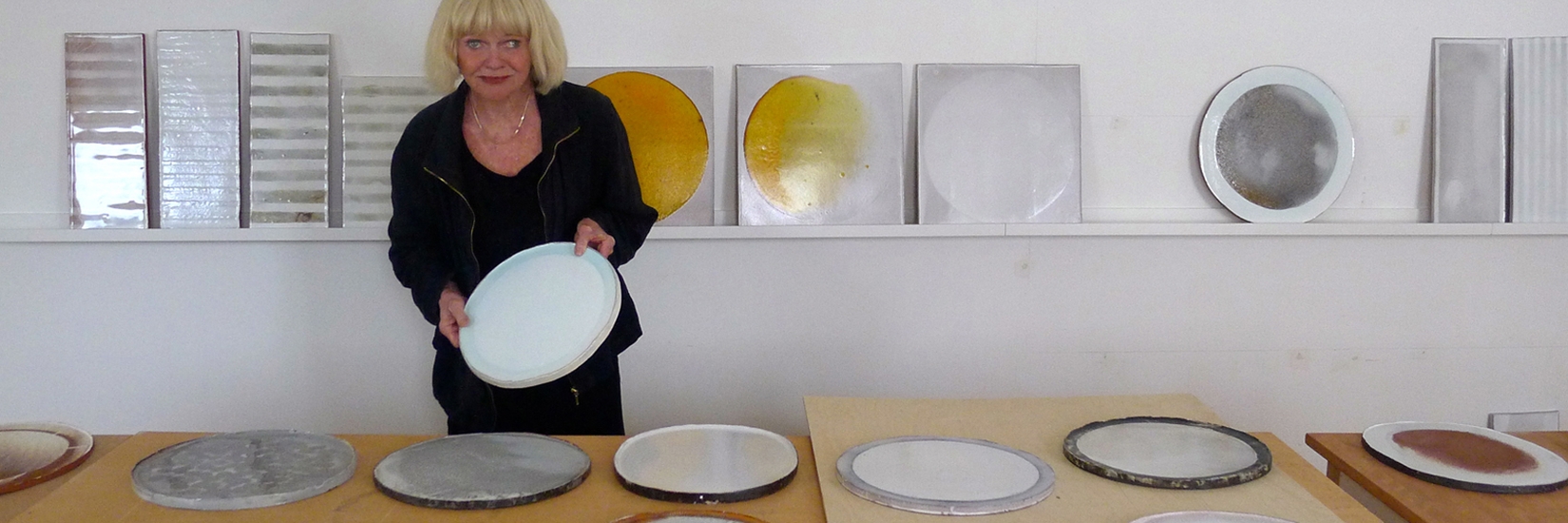 Jeg har arbeidet med keramikk siden 1975, i et område mellom bilde og bruksting som fliser, krukker, skåler, fat med mer, fra ganske stort til ganske lite format. Brukstingenes rike historie, alle assosiasjonene de bærer med seg og mangfoldet av uttrykk tiltrekker meg, mer enn å løse rent praktiske bruksoppgaver. I de senere årene har jeg i større grad utnyttet de maleriske mulighetene som glasur og leire har, og inkluderer mer uventede virkninger fra flere runder med brenning. Jeg arbeider med farge, tekstur og dybdevirkninger i dialog med de fysiske og kjemiske variasjonene som materialet selv byr på. (Foto over: Elisa Helland-Hansen, til venstre: Lars Brunborg)