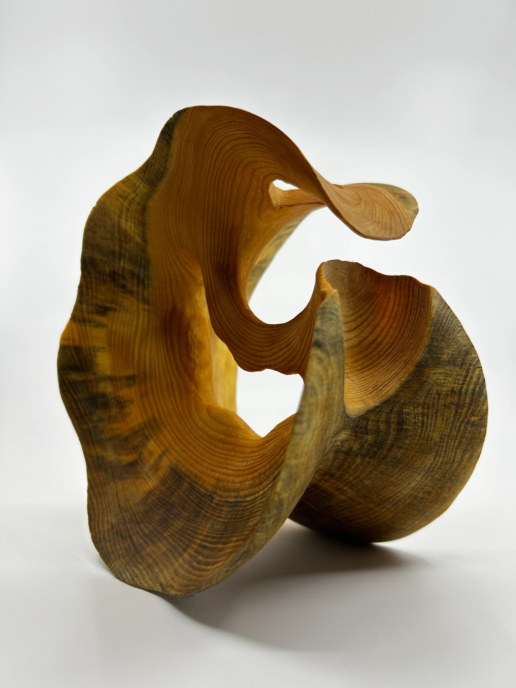 Ei skulpturell og avgrensa form i tre utskoren for hand av eit enkeltståande emne. Skulpturen er utarbeida i endeved og utgangspunktet har vore å utforska treet sine grenser, og overgangar mellom trad…