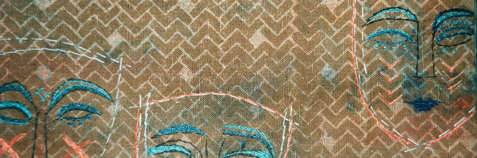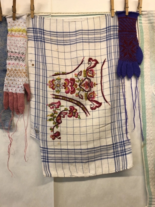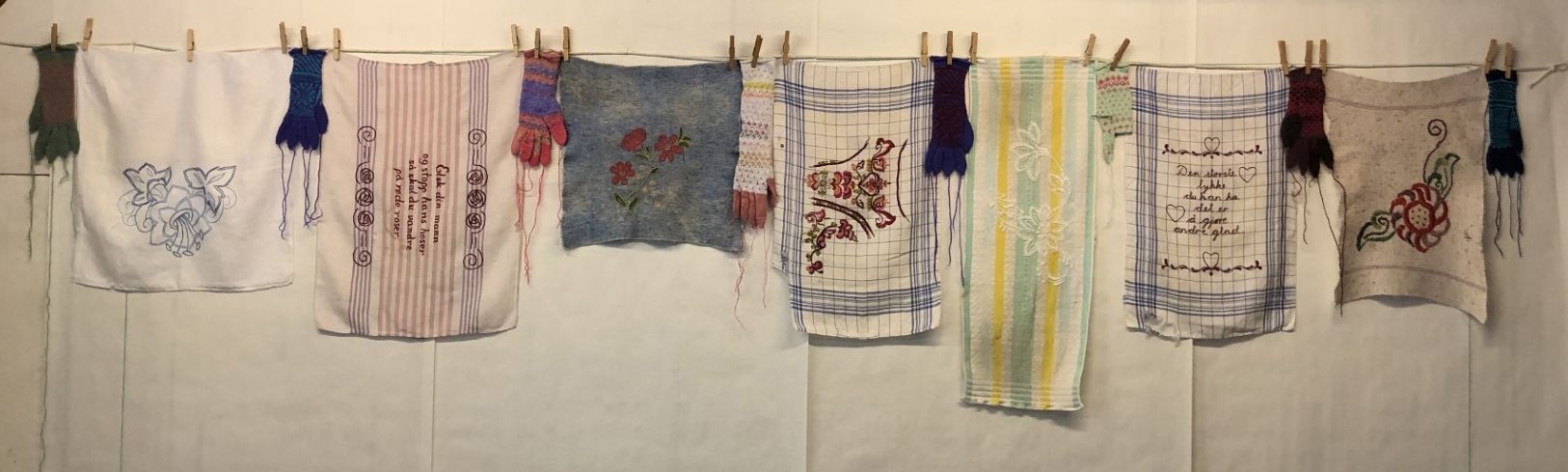 Installasjon, h.80 x l. 400 cm 7 broderier på slitte husholdningtekstiler og 8 vanter på klessnor med klyper. Menneskene har alltid søkt skjønnheten. I hverdagen går den hånd i hånd med slitet og det…