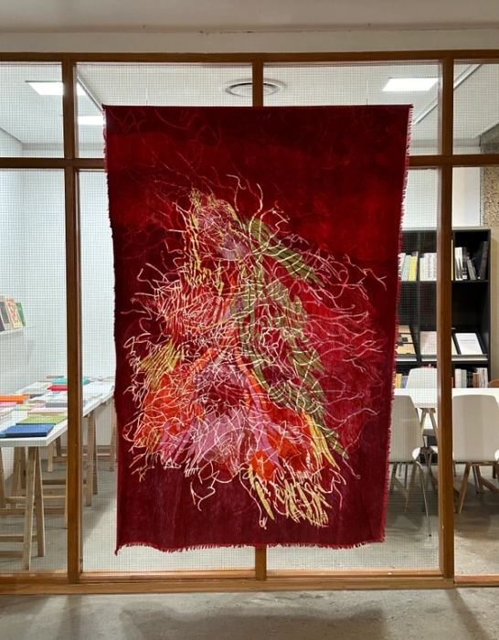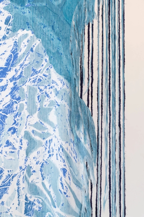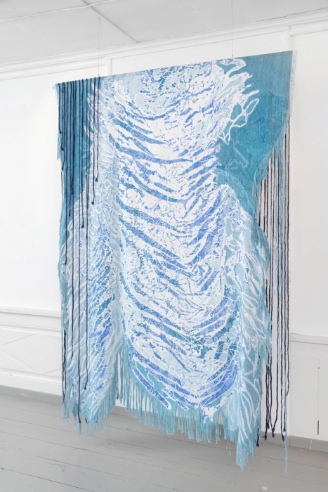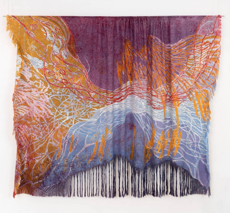 NK Årsutstilling 2021 Sørlandets Kunstmuseum Stofftrykk-monotypi/applikert collage/frynser. H 3,10m x B 1,80m. Foto: Alf-Georg Dannevig