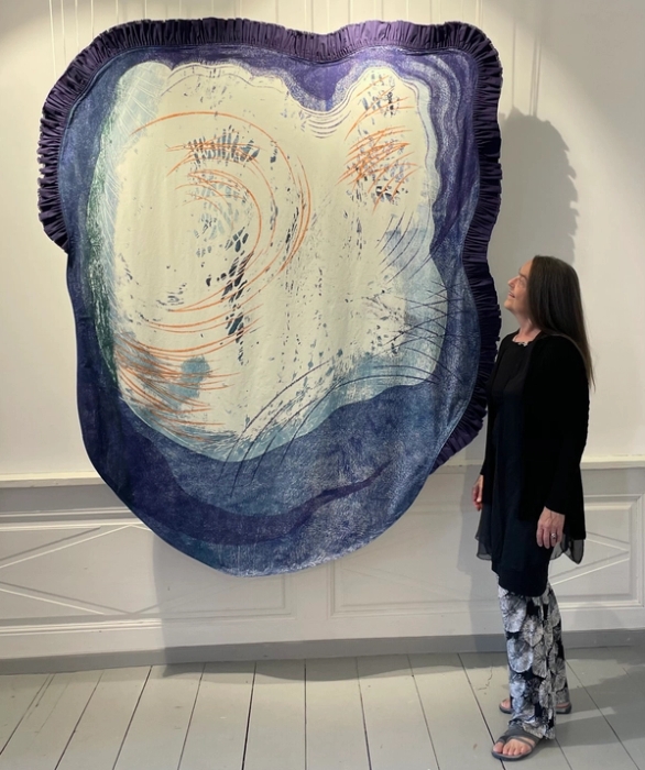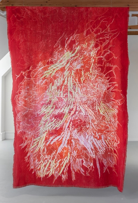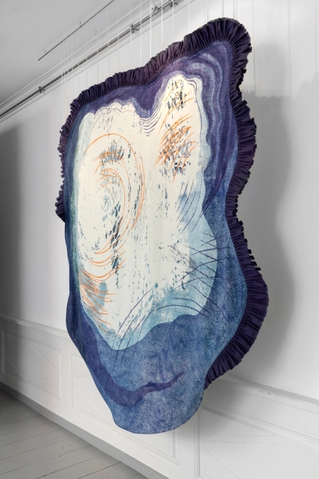 Stofftrykk-Monotypi med innfarget rynkekant. H 2,00m x B 1,70m Foto: Øystein Thorvaldsen