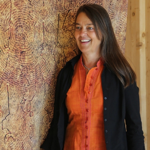 Offentlig kunstoppdrag til seremonirommet på Øystre Slidre Helsetun. Stofftrykk-monotypi på bomull. H 1,60m x B 2,30m. Foto: Øystein Thorvaldsen