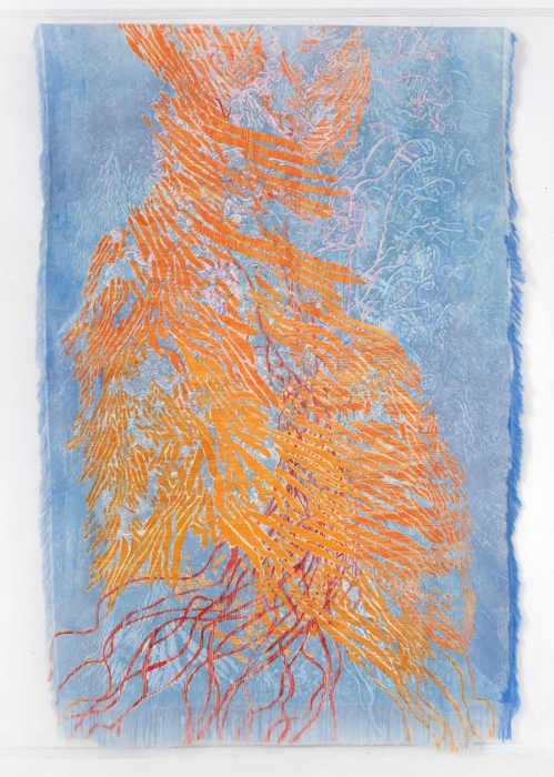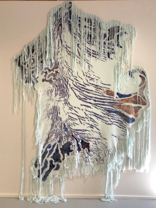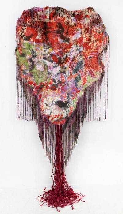 Stofftrykk-monotypi/ relieff/applikert collage/frynser. H 2,00m x B 1,30m. Foto: Øystein Thorvaldsen