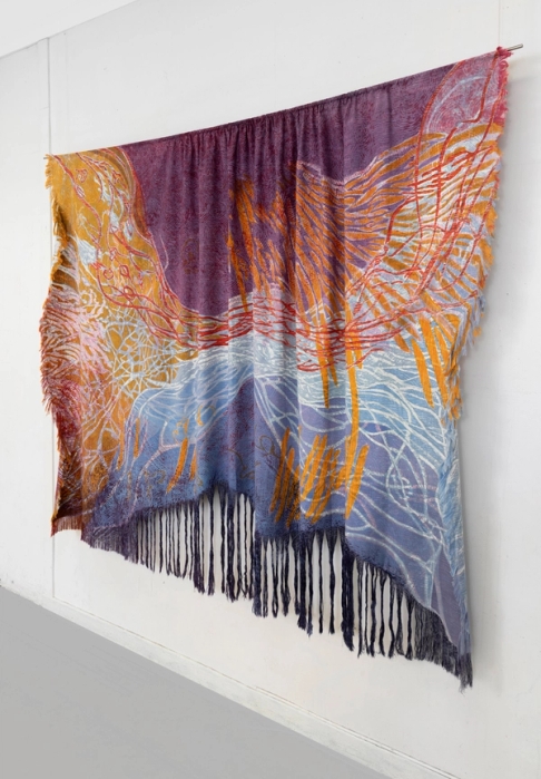Stofftrykk-monotypi/frynser H1,60mxB1,80m Foto: Øystein Thorvaldsen