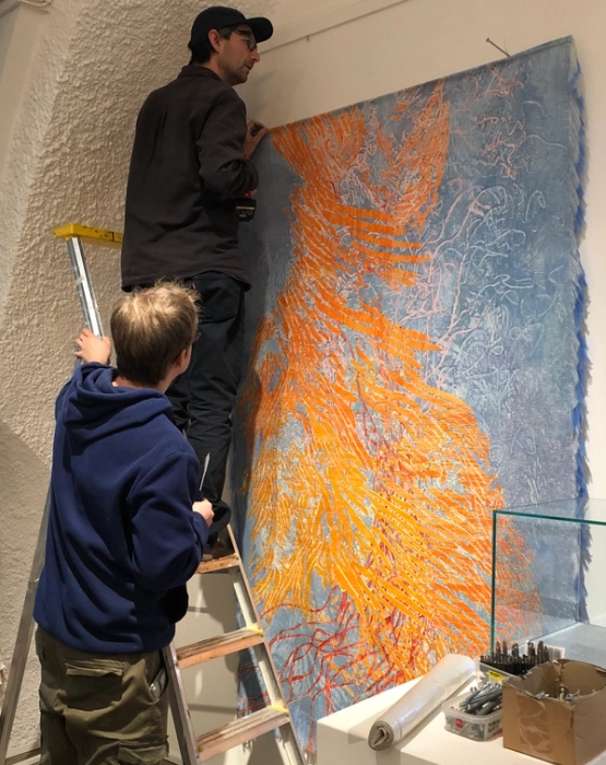 Stofftrykk-monotypi/søm/objekt. H 2,00m x B 0,80m x D 0,15m. Foto: Øystein Thorvaldsen