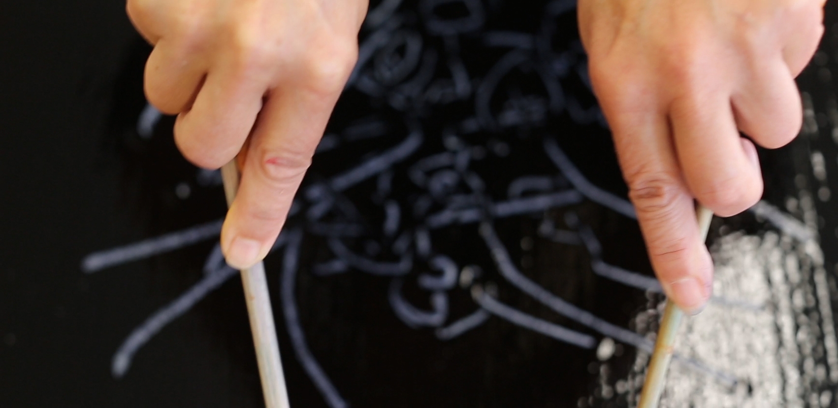 Stofftrykk-monotypi/frynser/fletter/dreads H 2,33m x B 1,60m Foto: Øystein Thorvaldsen