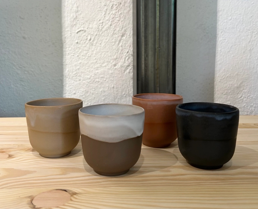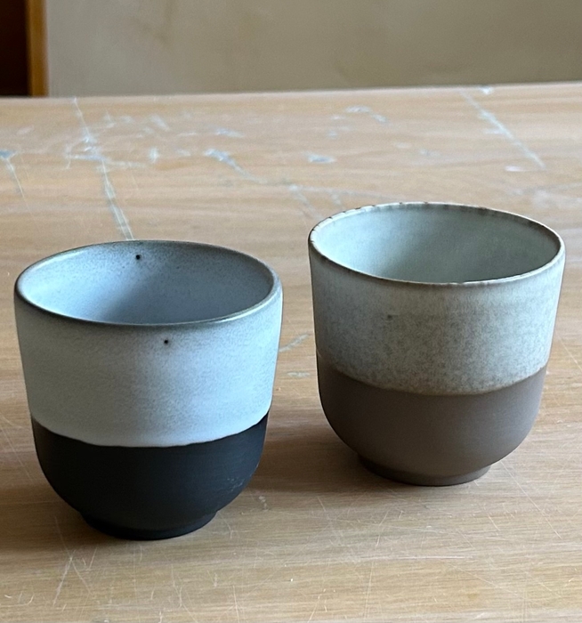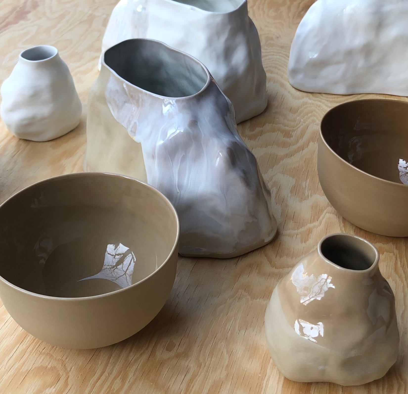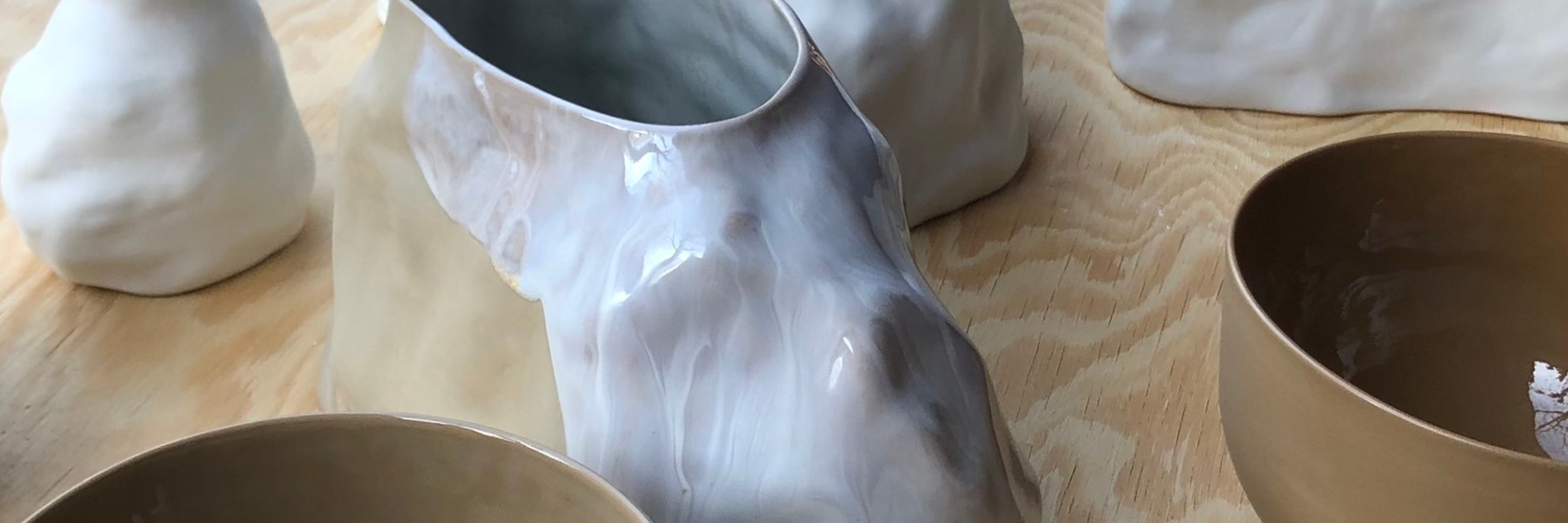 En serie vaser og potter som undersøker hvordan samme form uttrykkes ulikt gjennom ulik teknikk og materiale. Jeg benytter porselen og støpeteknikk, munnblåst glass og håndbygd steingods.