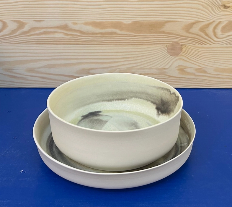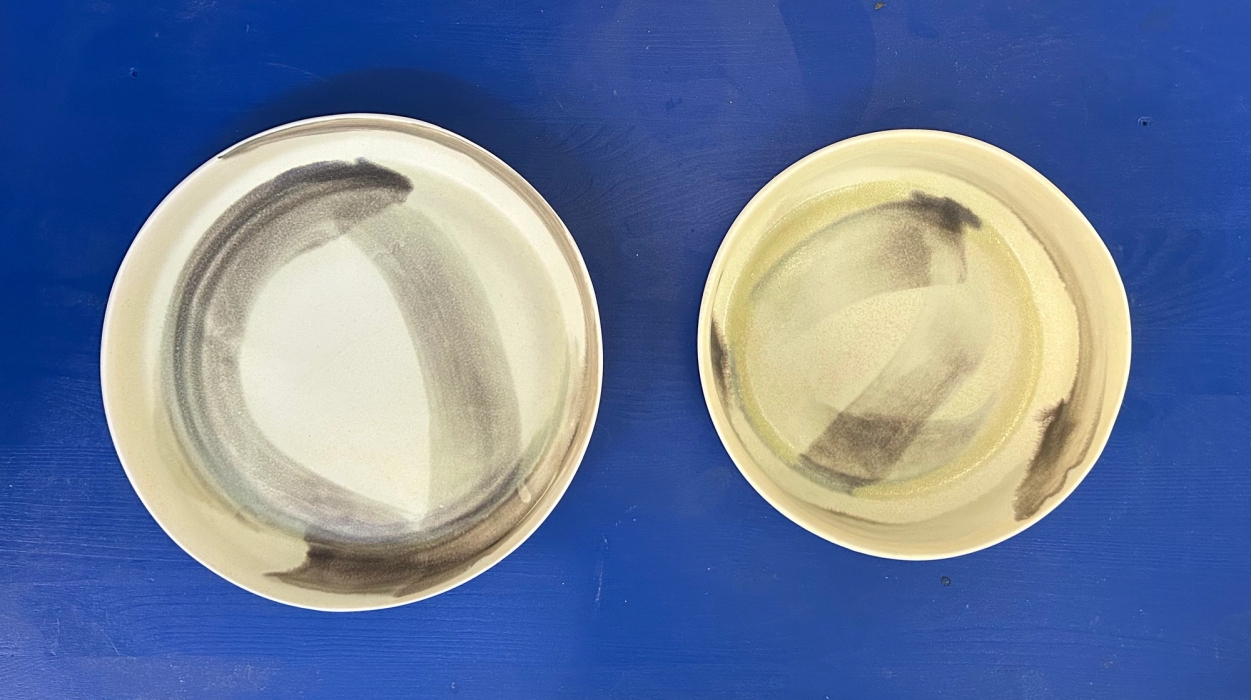 Håndlagde fat i porselen. Dekoren påføres med brede, lekne penselstrøk for å understreke men også utfordre formenes stramhet. Fatene er uglasert på utsiden for å fremheve materialet.