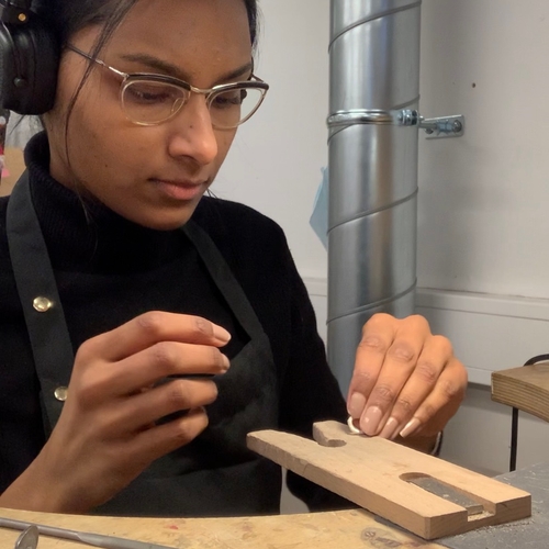 By combining her interests of function and fantasy, Shitika’s aim is to create pieces of artwork that not only can be represented on their own as hybrid sculptural objects but can be functional body jewellery such as face masks and body armour. Her aim is to present movement within the static formations. A slight deceptive property to the eye where these formations create an illusion of movement, by presenting elongated shapes that blend into a metal construction. She works a lot with photographing, drawing and repeating the layered process to then transform her drawings into sculptural 3D objects.Her aim is to continue to explore the making and use of recycled plastic in her works.