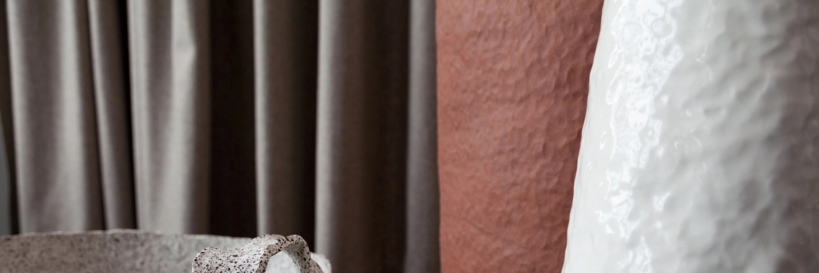 Four image surfaces in porcelain with vessels and handles from Bigware (Sisse Lee, 2018), Tulla Eliasson Cluster of vessels in colored porcelain and stoneware, Sisse Lee Duo-exhibition at RAM Galleri…