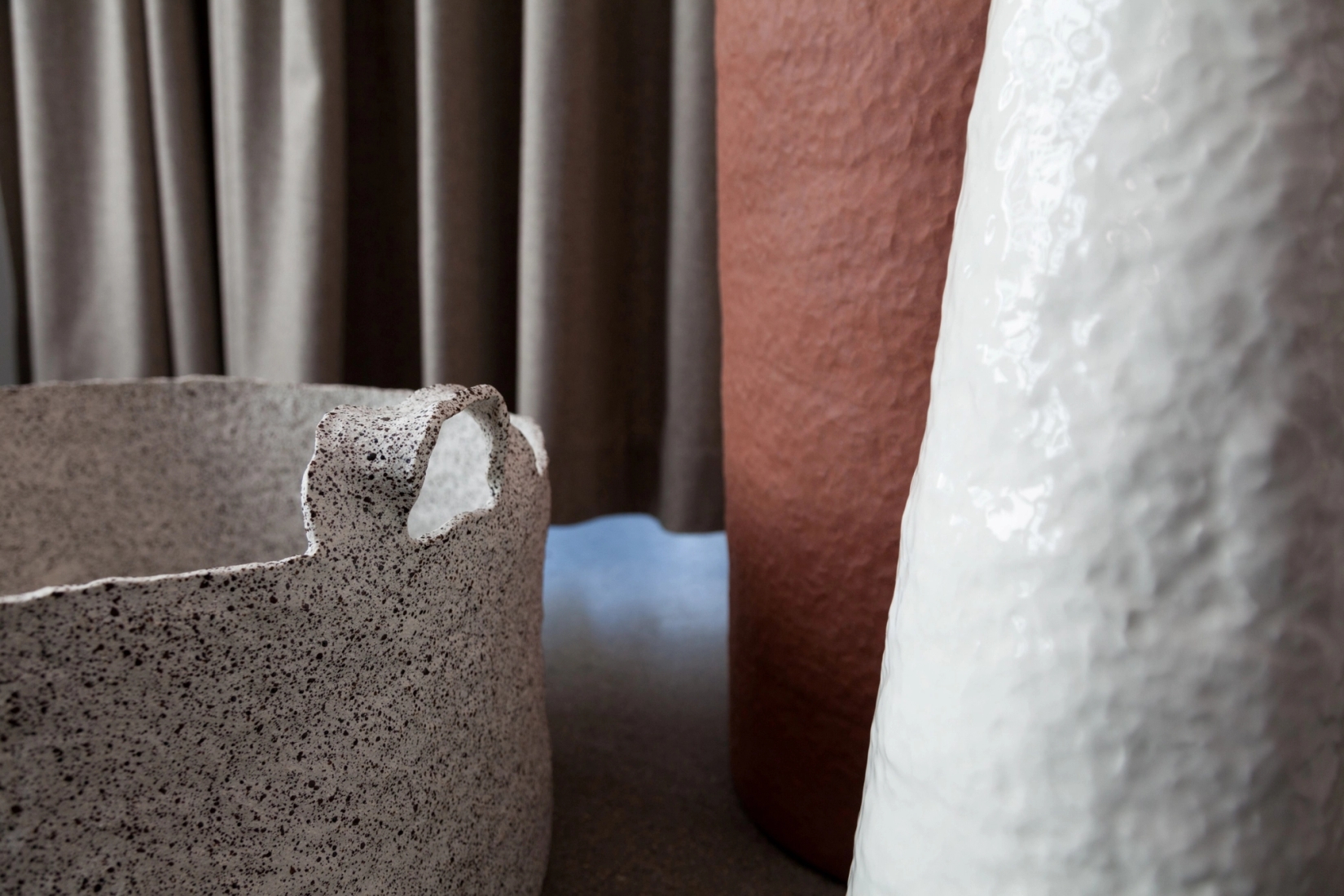 White stoneware with Icelandic volcanic sand and lovehandles, red earthenware with donut-handles, porcelain cone with transparent glaze, black stoneware cylinder, and porcelain with inner glaze Exh…