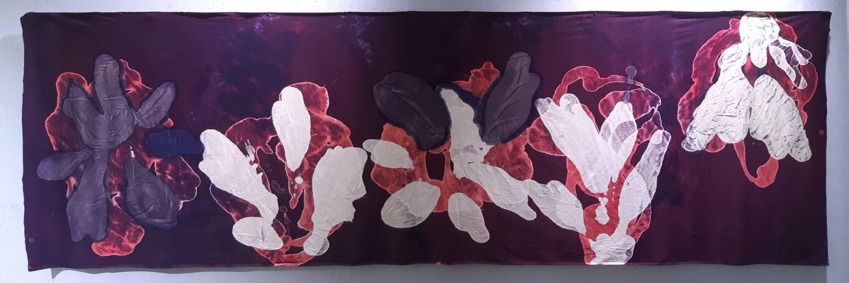 Galleri Salhus, Bergen Fra gruppeutstillingen "KMD Textiles 2025" Arbeidet er laget med flytende tekstilfarge og hvitets på bomull, 220x145 cm.