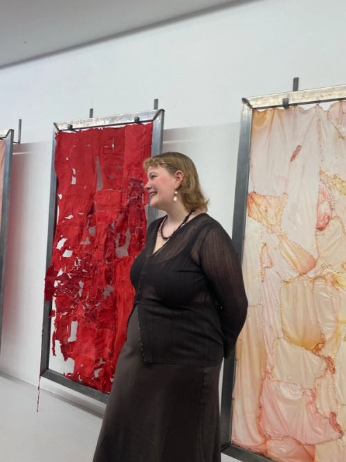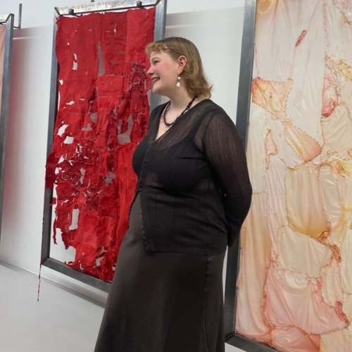 Sofie Alm Nordsveen (f.1997, Oslo) har en BFA i materialbasert kunst fra KHiO og en MFA i Craft fra HDK-Valand. Hun er en tekstil og tekst basert kunstner som arbeider med konseptuelt håndverk. I sitt arbeide forsøker hun å forstå det menneskelige kjøttet og hvordan vi ser på og forstår kropp. De siste årene har hun arbeidet med vold og traumer i relasjon til kroppen, men også identitet, omsorg, relasjoner og felleskap som en motvekt til undertrykkelsen og motstanden kroppene våre utsettes for gjennom livet. Hun tar utgangspunkt i tekstile metoder og materialer som silke, velur og viskose, men også menneskehår, latex, keramikk og metall.