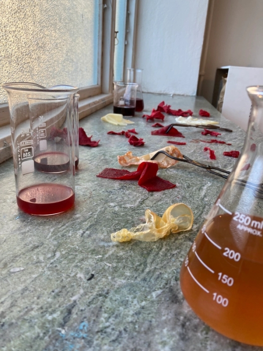 "Fragments of my body" (2024) er et prosessarbeid til "Can I (please) have it back?" (2024), Utstilt på Galleri Monitor, Gothenburg Ull, latex, silke, nylon, syrefarge, glassflasker og tenger
