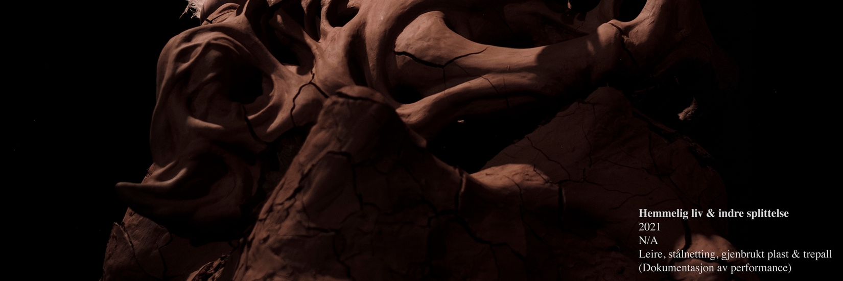 I mitt virke jobber jeg med leire, keramikk, tekstil, fotografi, tekst, og det performative med kostyme og maske. De kunstneriske prosjektene starter med en primitiv fremgangsmåte, hvor materialer blir dekonstruert eller satt sammen biter av f.eks leire eller tekstil. Før de videre utvikler seg dynamisk i en langsom og intens prosess, der jeg går inn i en intuitiv dialog med materialet. Arbeidene bærer preg av mystikk og mørke, og viser seg som organiske skulpturer/installasjoner i en transformativ tilstand. De kan fremstå som tiltrekkende og frastøtende på en og samme tid, og kan minne om noe underjordisk med sitt formspråk i brune, lyse eller metalliske fargetoner.