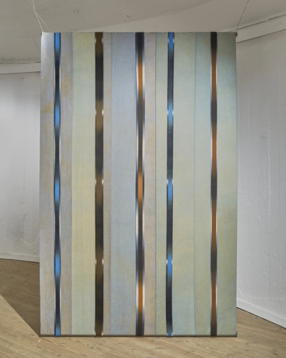 tre tekstile verk som pryder avgangshallen. Utgangspunket er de særegne fjellformasjonene på Svalbard, lyset, og horisontlinjen der hav møter land. Denne linjen vil på et gitt sted i rommet følge lyss…