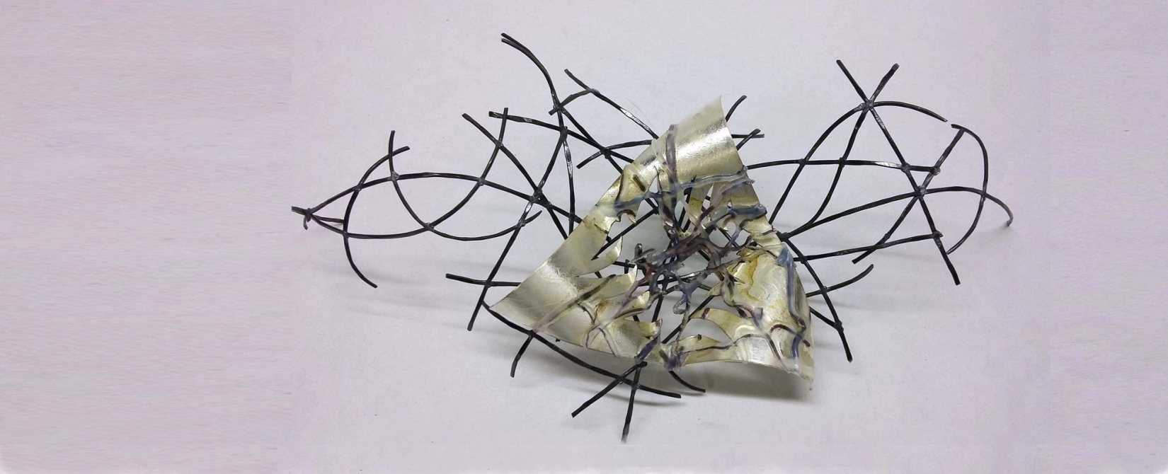 Sammenstilling av former. Fokus på retninger og mellomrom. Kontrast mellom formenes egenart i farge og materialer. Det mørke, røffe og matte jernet opp mot det blanke, varme kobberet.