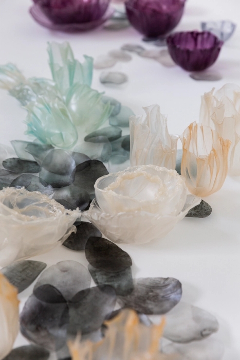 In Asia, food is often offered to ancestors and various deities; while in the west, flowers are brought. In this piece, rice is a material being used for personal identity, and flowers made from rice…