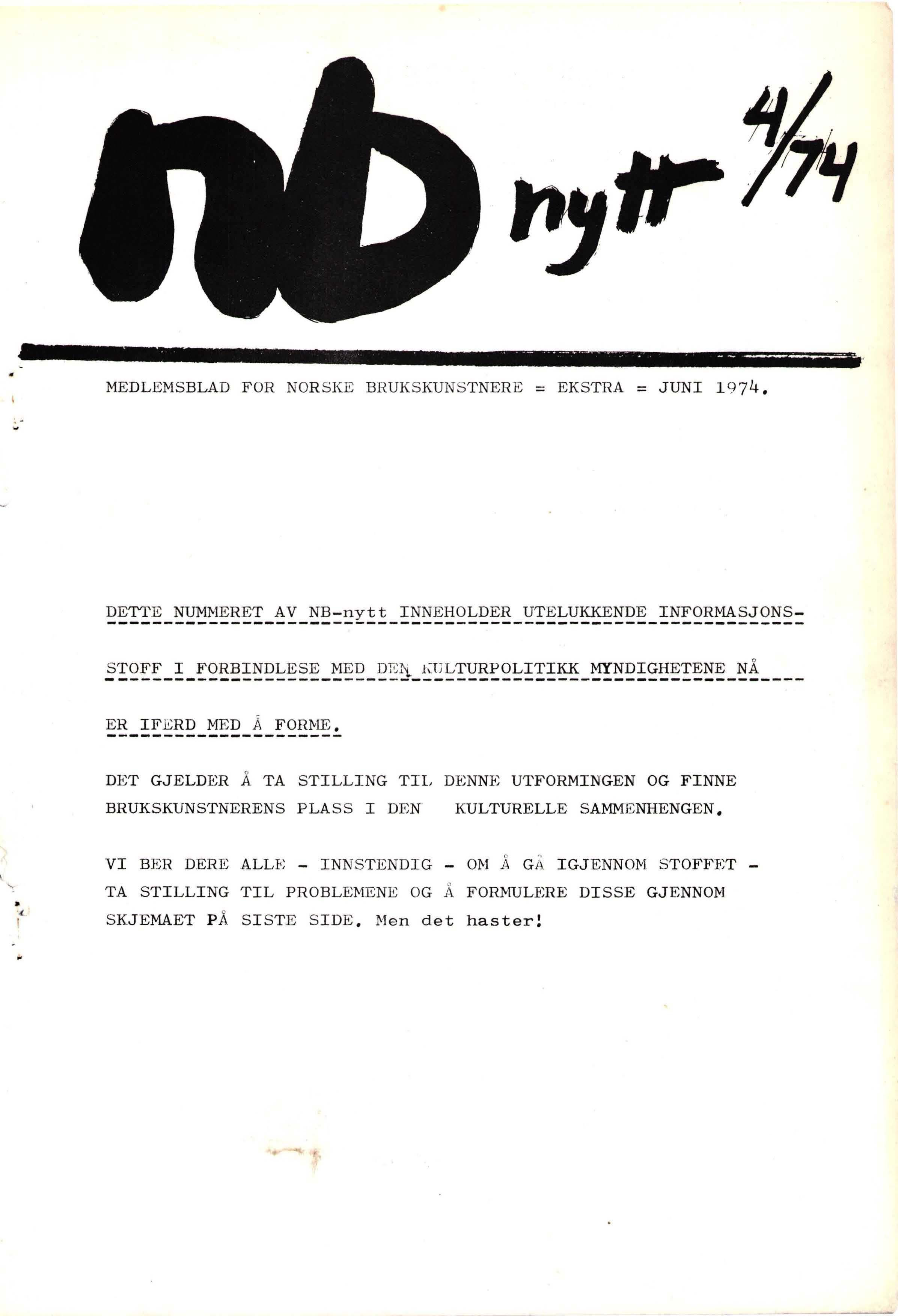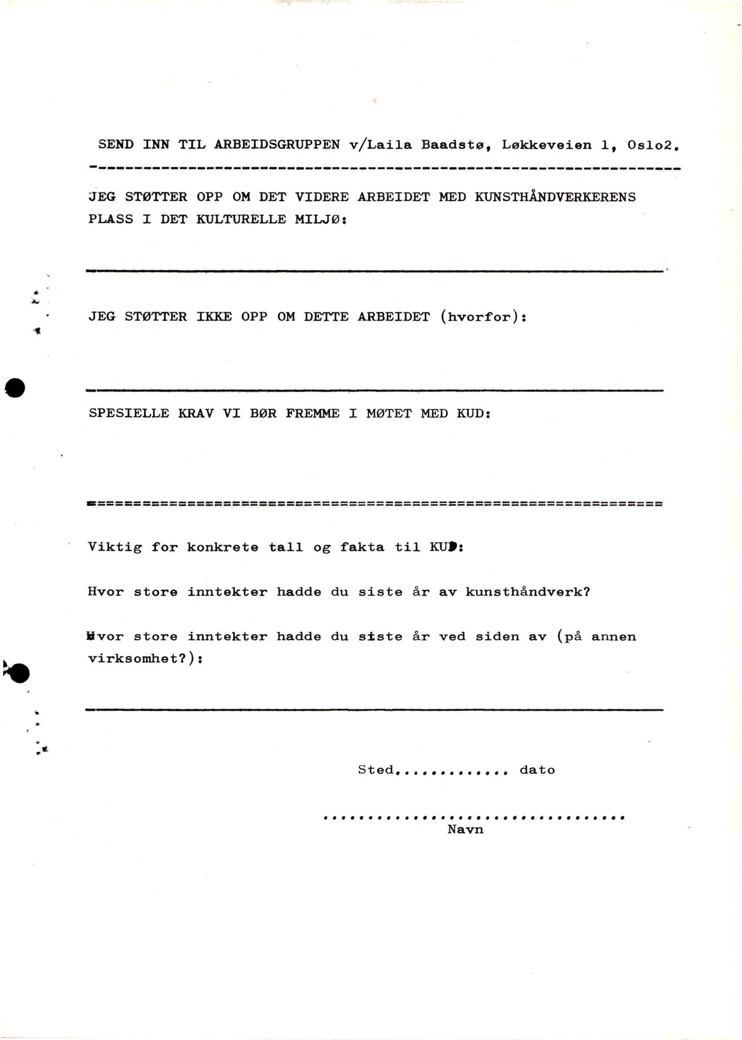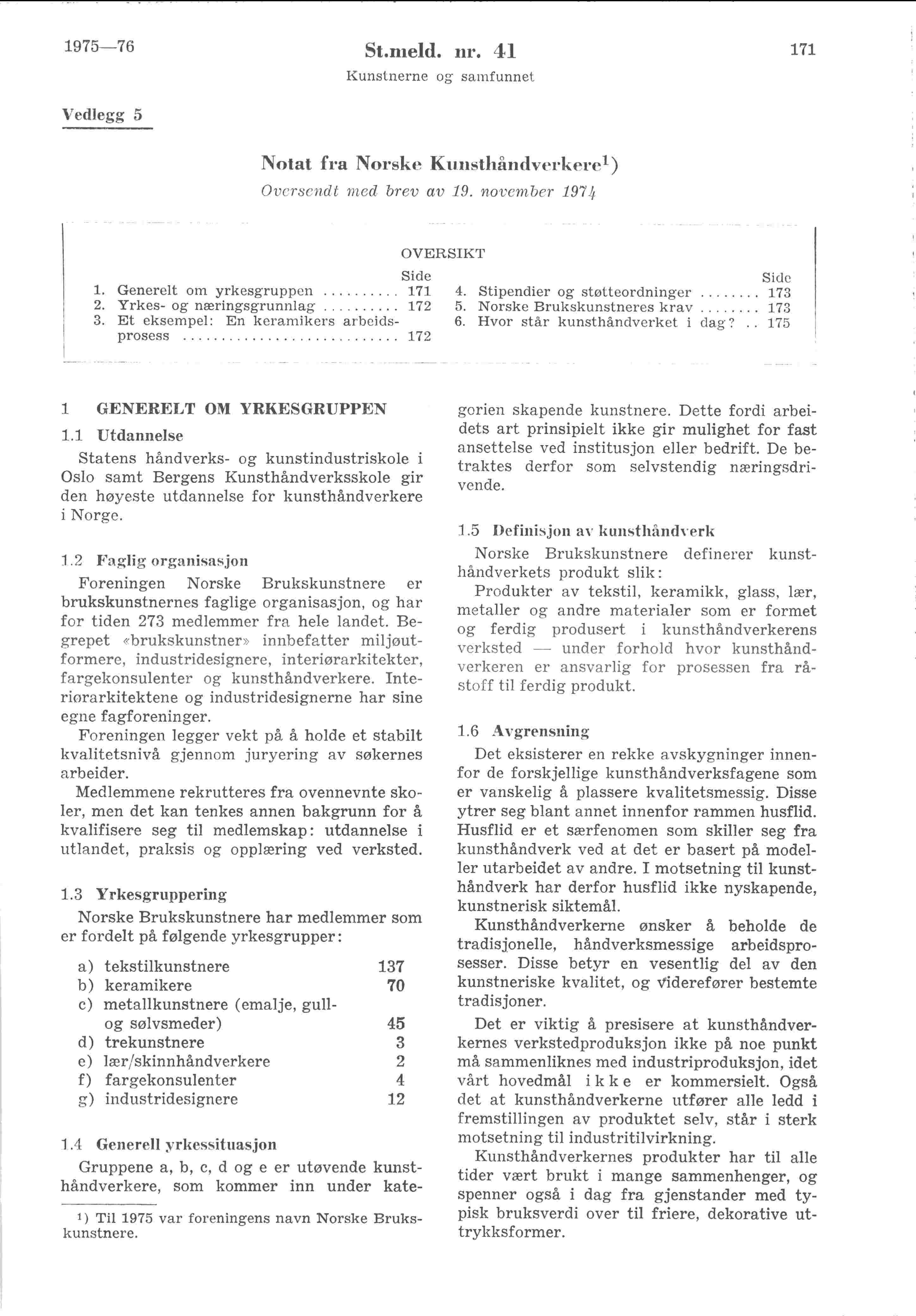Norske Brukskunstnere leverte senhøsten 1974 et omfattende notat som redegjorde for kunsthåndverkerne som yrkesgruppe, deres utdanning, kunstneriske praksiser, yrkes- og næringsgrunnlag, tilgang på stipendordninger og generelt utfordrende arbeidsforhold. Notatet var basert på en spørreundersøkelse blant medlemmene og inneholdt også organisasjonens krav til myndighetene. Det var Anne Marie Vadum, Laila Baadstø og Mona Prytz som stod bak notatet. Vedlegget ble trykket som et vedlegg til stortingsmelding nr. 41 Kunstnerne og samfunnet, som kom i januar 1976.